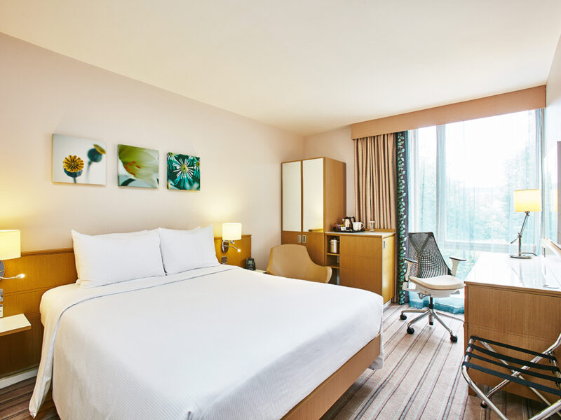 The hotel offers 238 guest rooms with a choice of one double or two twin size beds, each room is equipped with air cooling, a 42 inch HDTV, an oversized desk, complimentary Wi-Fi, ergonomic chair, floor-to-ceiling windows, a deluxe bathroom with walk in shower.
