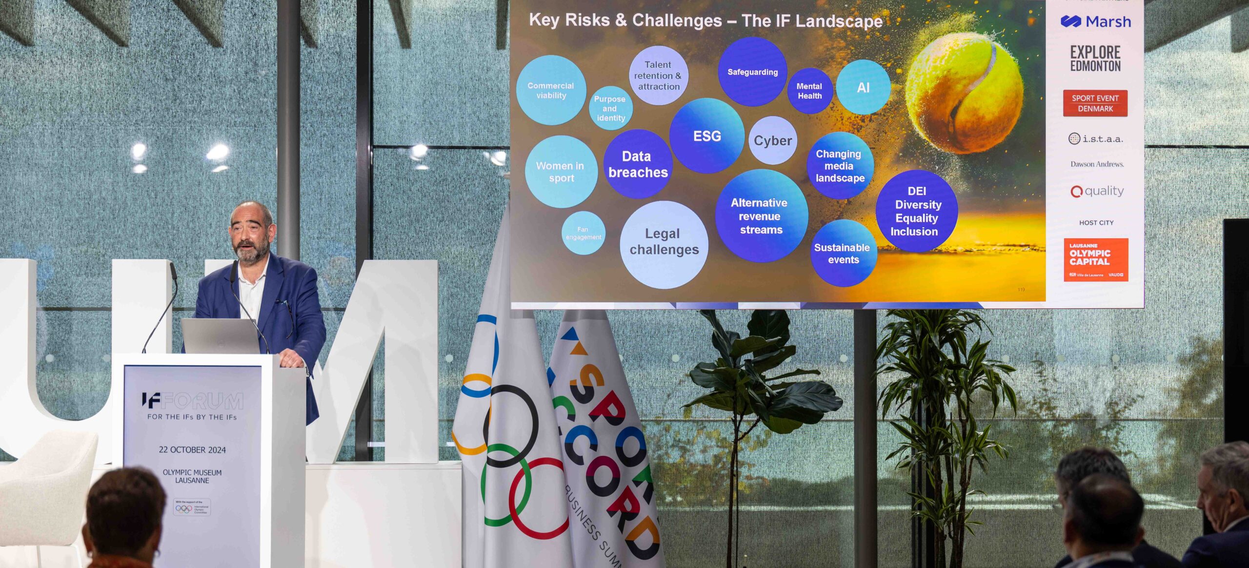 The IF Forum, hosted by SportAccord in Lausanne, takes place annually and addresses the specific needs of Olympic and non-Olympic International Federations. The Forum focuses on sharing best practices and knowledge on critical topics. The three-day event is by invitation only and open to International Federations including members of ASOIF, WOF, ARISF, and AIMS. The IF Forum gathers more than 400 leaders from the IOC, IFs, sports business leaders, and exclusive IF Forum partners.